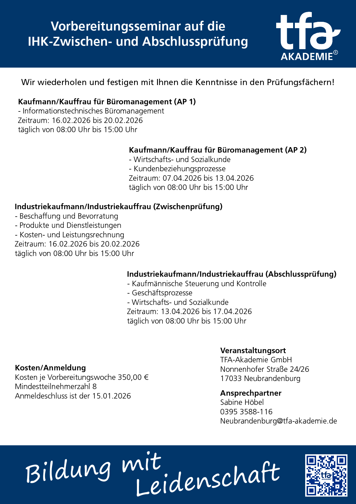 Tel.: 0395 3588-116, Mail: neubrandenburg@tfa-akademie.de